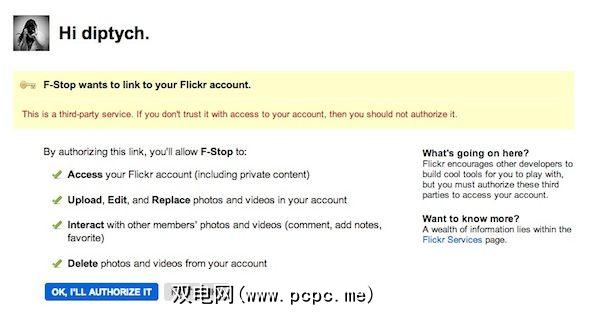 要开始使用F-Stop,请从Mac App Store下载[不再可用],并授权该应用访问您的Flickr帐户。这意味着该应用可以访问您的Flickr帐户(包括私人内容),上载,编辑和替换照片(和视频),与其他Flickr成员及其内容进行交互以及从您的帐户中删除照片和视频。
