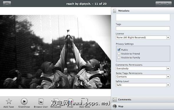 您可以通过多种方式与单个照片进行交互。您可以在Flickr网站上查看照片,查看其元数据(尽管根据我们的经验,EXIF详细信息(无论是使用iPhone还是DSLR拍摄,只是没有显示),以及已经添加到照片中的任何标签(您可以添加更多),注释和注释/标签权限及其安全级别。您还可以在本地调整所有这些设置,因此,如果要将照片从公开更改为私人,可以直接从应用程序进行操作,而无需启动Flickr网站。如果照片中有注释或地理标记信息,则也可以从此窗口中查看所有这些信息。