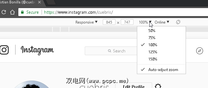 然后,单击位于水平“检查"面板右上方的设备图标(上方的图片,到元素标签)。鼠标悬停时,它应显示为“切换设备工具栏"。 小选项面板应该会在您的Instagram网页上弹出。
