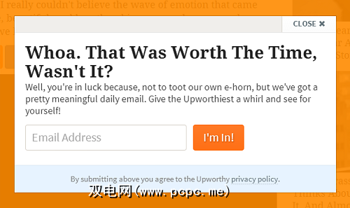 现在,我知道Upworthy并不完美。他们有令人讨厌的弹出式窗口,将您的整个屏幕变成橙色,如下所示,而且他们的一些头条新闻如此俗气,不知所措,真是令人发指,但实际上,弊大于利。