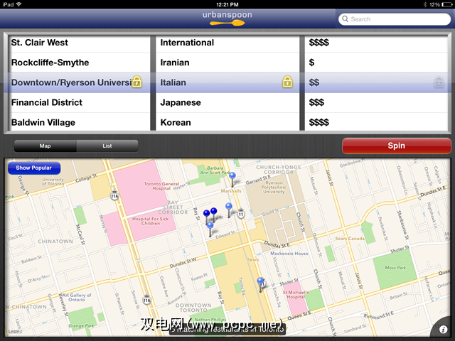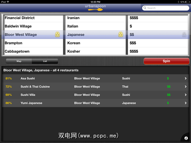 但这不是为什么将微调器称为微调器。之所以称为旋转器,是因为它(您猜对了)旋转!现在,我们来探讨Urbanspoon的最佳功能,也许是该服务最著名的功能:如果您无法选择,只需摇晃设备或点按“旋转"按钮,即可找一家随机的餐厅尝试。