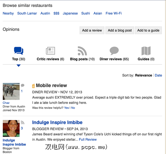 向下滚动到完整评论部分,您可以在其中阅读所有餐厅的评论或过滤它们,以便您只看到用户评论,评论评论,博客文章或指南。