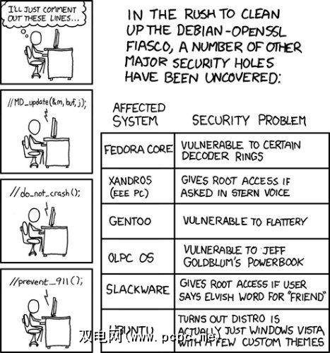 从Debian的OpenSSL软件包中删除了两行代码,因为它们在Valgrind和Purify构建工具中生成警告消息。线条被删除,警告消失了。但是Debian实施OpenSSL的完整性受到了根本性的损害。