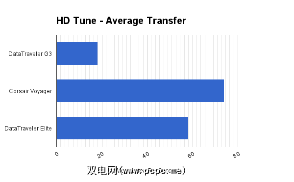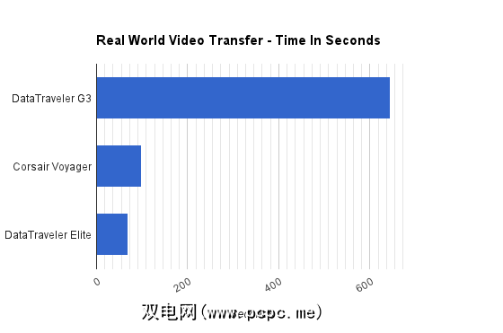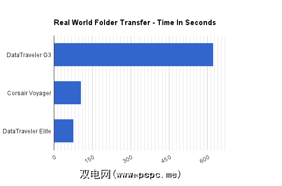 哇。该图说明了一切,不是吗? DataTraveler G3 USB 2.0耗时10分钟(23秒)来传输文件夹。 Corsair Flash Voyager Slider USB 3.0只需1分钟47秒,而DataTraveler Elite USB 3.0只需1分钟16秒。这是USB 2.0和3.0之间的巨大差距。