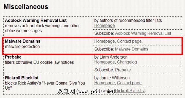 并向下滚动至“其他"部分下的“恶意软件域" 。点击“订阅:恶意软件域"链接,然后在短暂的弹出窗口后,您将受到保护。只要您访问恶意链接,Adblock Plus就会立即阻止您访问它。