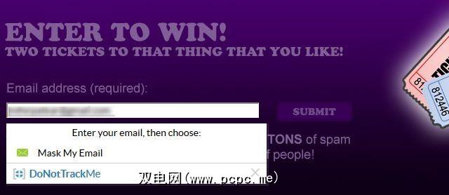DNTM中的一个很酷的功能是电子邮件掩码。您知道您是如何访问网站的,无论出于何种原因都被迫输入电子邮件地址,然后遭受垃圾邮件攻击?嗯,有一些很棒的一次性电子邮件服务,但是DNTM集成在您的浏览器中,并配有方便的仪表板,因此使它变得更容易。当您在提供的框中输入我们的电子邮件时,扩展程序会询问您是否要屏蔽它。选择是,Abine将抛出一个随机的电子邮件地址,该地址会将所有邮件自动转发到您刚才输入的电子邮件中。因此,如果您想在任何时候阻止该网站向您发送电子邮件,那么您所需要做的就是前往DNTM信息中心并禁用该屏蔽的一次性电子邮件。