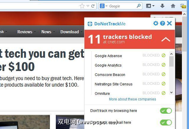 现在众所周知,网站会跟踪您出售广告,包括Google和Facebook之类的巨头。 DoNotTrackMe(DNTM)是阻止这些家伙前进的最佳途径。 Abine的扩展名以前称为Do Not Track Plus,它将在您访问网页时通知您任何网页正在尝试跟踪的所有数据。安装并进入任何网站后,它将自动停止网站上的各种跟踪器,例如Google Adsense,Demandbase,Doubleclick,Facebook Connect,Twitter,Google + 1,LinkedIn等。当然,您需要激活“不要在这里跟踪我的浏览",并且可以随时将其关闭。