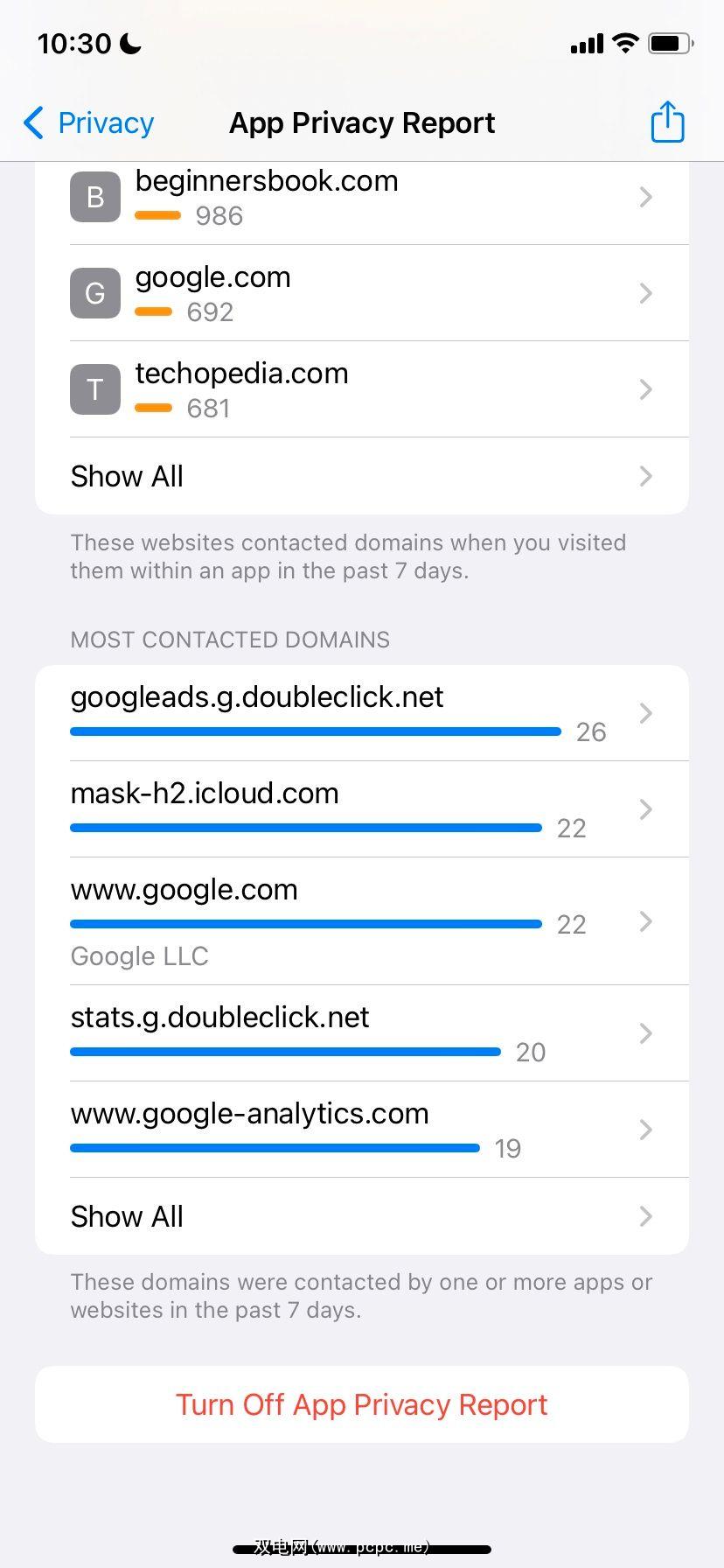 此部分详细说明了您在应用程序中访问的所有应用程序和网站所联系的域,然后根据与其关联的应用程序数量对它们进行排名。最常联系的域可能用于为个性化广告创建活动的自定义配置文件。