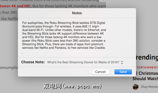 ,您将在其中看到一个弹出窗口,其中包含选定的文本。选择您想要保存的便笺,或创建一个新便笺。点击保存,然后完成。