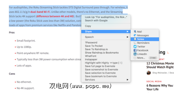 说您在一个包含有关该主题的有用信息的网页,您想保存它。只需突出显示文本,右键单击,选择 Share ,然后选择 Notes 。