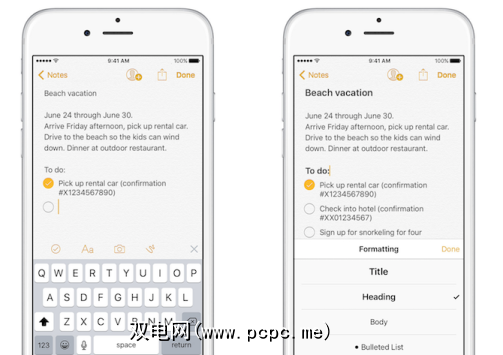 Apple Notes本身是一个非常简单的笔记工具。您甚至无法在iOS上创建子文件夹或添加标签,但是它的作用很好。虽然Evernote可能会每年执行3次策略,改变其定价策略和界面,在他们认为合适时限制功能,但Apple Notes却没有。