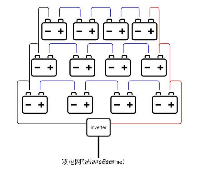 使用这种类型的电池,您需要使用12块电池,至少要花费2400美元。您将有3组4块电池串联连接。然后将这三个组并联。这实际上将为您提供48V和300Ah。下图显示了外观。
