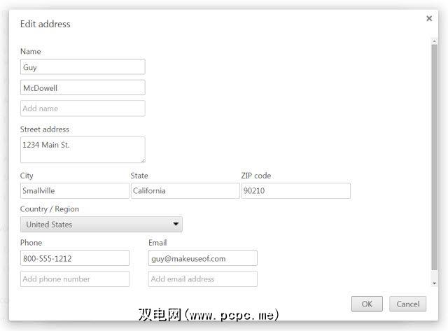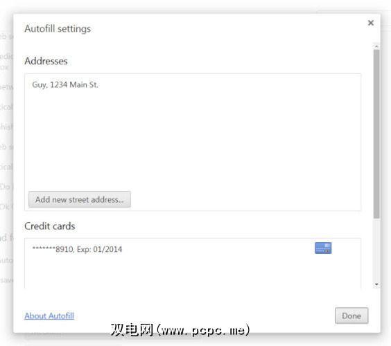 假设您从办公桌上起床喝咖啡。您的浏览器已打开。随之而来的是坏人,在一秒钟内他们有您的地址,也许还有信用卡信息。在Chrome中,他们要做的就是在地址栏中输入 chrome:// settings / autofill 并向上弹出以下窗口。
