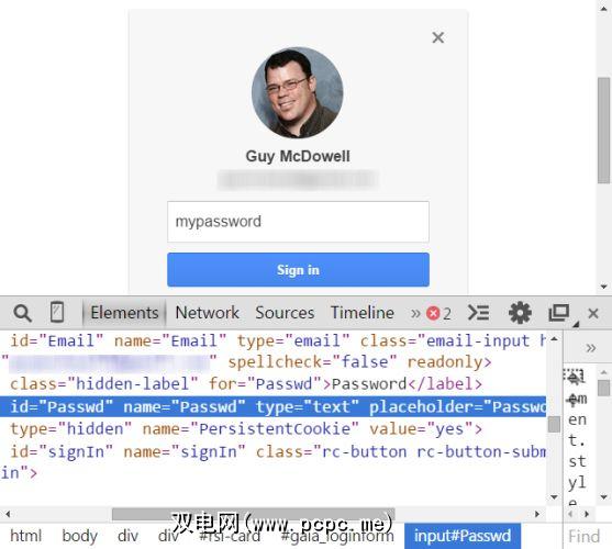 一旦 Element Inspector 已打开,他们可以将字段类型从密码更改为文本。繁荣!密码泄露。不相信我吗?看下面的图片。还是不相信吗?