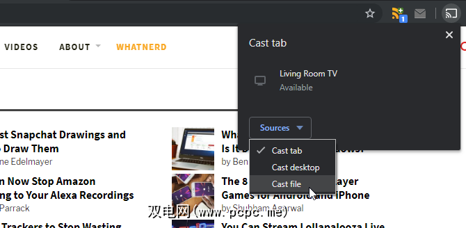 文件准备就绪后,单击Chrome中的Chromecast图标,然后单击源。在出现的下拉框中,单击 Cast File 。