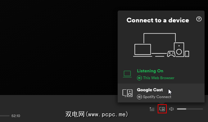 如果要播放音乐,请在PC上看到Chromecast设备。单击此图标时弹出窗口。单击您的设备,Spotify将开始在您的Chromecast上播放。