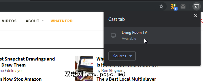 如上所述,在浏览器右上方找到Chromecast图标,然后单击它。但是,这次不要单击要投射到的屏幕;而是单击显示下方的 Sources 。