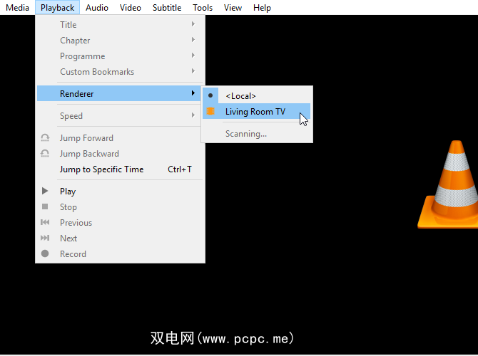 如果您使用的是最新版本的VLC,则可以通过点击将其投射到Chromecast 播放,然后将鼠标悬停在渲染器上。