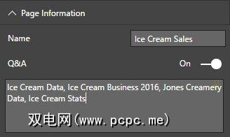 下一步,将“问题与解答"滑块转到打开强>。应该为您提供一个准备好接受备用名称的字段。这些名称将帮助您和其他用户通过与Cortana交谈或在Power BI的“问答"字段中输入文本来访问报告。