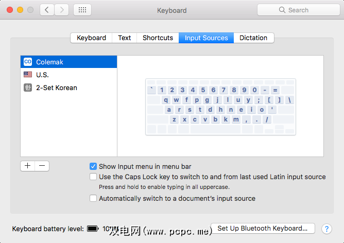 如果您使用非传统的键盘布局(例如Dvorak或Colemak),或者如果您有外语键盘,则可以在输入源部分中进行设置。