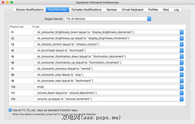 如果您需要进一步调整键盘,使其超出系统首选项所允许的范围,则可能需要安装Karabiner(用于El Capitan和之前的版本)或轻型子集Karabiner-Elements(用于Sierra及其之后的版本)。我使用Karabiner-Elements。