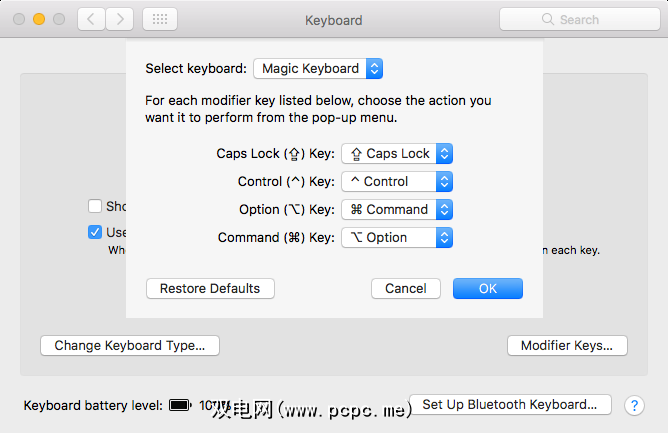 第二,单击修饰键... 重新排列修饰键。 Apple键盘将它们作为 Control , Option , Command 进行排序,而非Apple键盘则使用 Control , Windows ,替代。默认情况下,macOS将Windows键注册为Command,将Alt键注册为Option,因此将两者切换为``恢复正常''并防止混淆应用程序中的键盘快捷键。