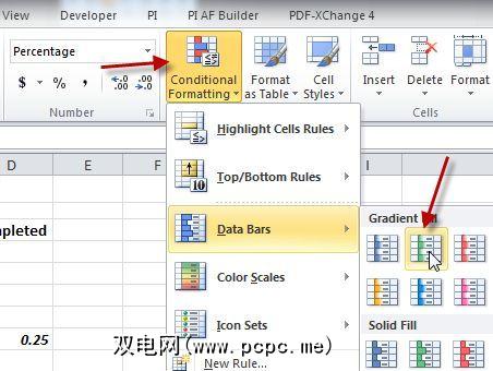 这是在所有任务下创建一个单元格,该任务将随着已完成任务总数的百分比。现在,要制作图形化图形,请单击“格式",然后为单元格选择“条件格式",然后选择数据条之一。