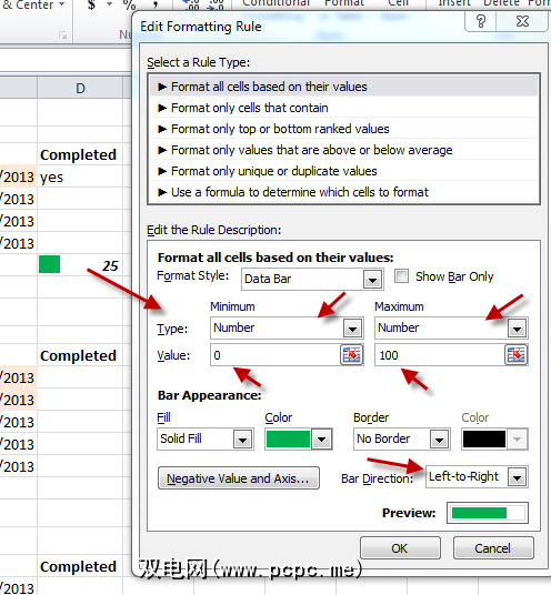 这会将单元格转换为数据条。现在,只需再次回到同一菜单项,然后选择“ 编辑规则" 。将下面显示的所有项目都用红色箭头设置为显示的值。