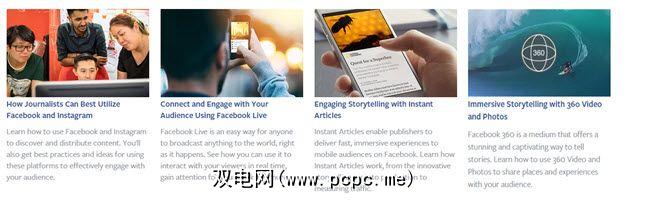 您可以在发布者工具。课程包括“新闻工作者如何最佳利用Facebook和Instagram",以及有关Facebook Live,360视频和照片以及Instant Articles的更多产品特定课程。