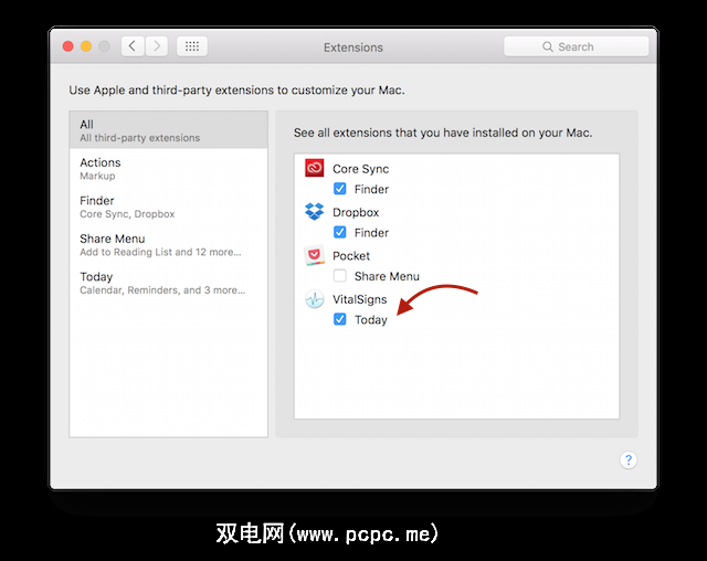 您可以通过转到系统偏好设置>扩展程序来实现。在这里,您会找到列出的VitalSigns,只需确保选中菜单项“ Today"。