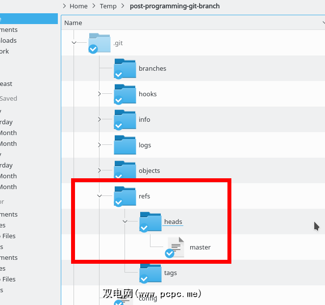 执行此操作时,它将在当前路径中创建一个隐藏目录,称为“ .git"。如果看不到该目录,请查阅我们先前有关查看hidden的文章。该目录包含保留文件修订历史记录所需的所有信息。将文件管理器设置为显示隐藏文件后,您可以打开.git文件夹并查看许多子目录。其中之一称为“ 引用"(如下图所示),其“ heads "子目录包含项目中所有分支的列表。一开始,您只有一个被称为“ master"。