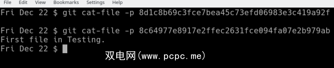 这些文件夹和文件名共同构成了ID进行特定更改(实际上是SHA1哈希)。您可以使用 git cat-file 命令浏览它们的内容。根据他们的修改日期,我们可以看到第一个开始的“ 8d"出现了,但没有任何显示。虽然开头的“ 8c"包含我们在“测试"分支中添加到文件中的文本行。