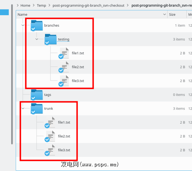 上面的输出告诉我们“ trunk"(SVN的“ master"版本)的全部内容已被复制。在文件管理器中查看时可以确认: