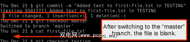 然后将一行文本添加到first-file.txt中,然后再提交。如果切换回master分支,则会发现文件仍为空白( cat 命令在终端中显示文件的内容):