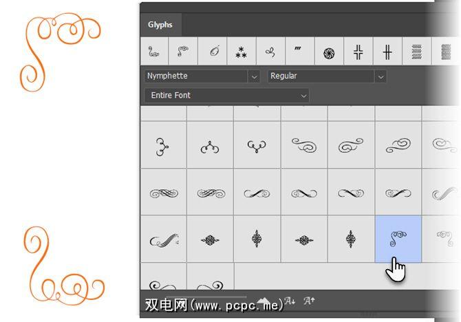 在图形设计项目中使用字形作为即时装饰的快捷方式。只需从正确的字体开始。您将遇到几种具有最佳字形的草书字体。您可以在Photoshop的字形面板或Windows字符映射表中浏览扩展的字符集。然后,启动Adobe Photoshop CC。