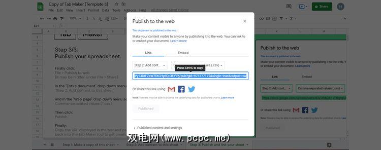 然后从整个文档下拉选项中,选择Add Content to This Sheet。最后,单击Publish,将生成一个链接,您现在可以将其粘贴到 Tab Maker 页面中。