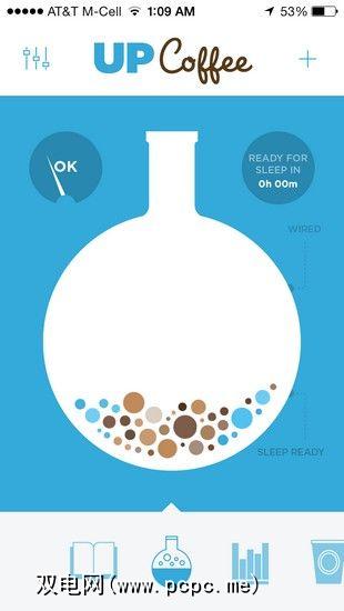 在初始设置后打开应用时,您会看到什么样一个装有小点的烧杯,代表您的咖啡因摄入量。有两个标签:“睡眠就绪"和一个较高的标签为“有线",显示您当前的化学辅助警报级别。