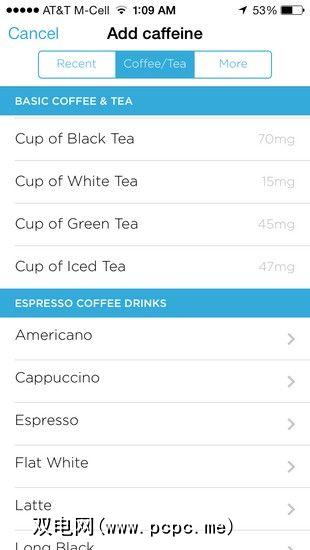 点击屏幕右上方的加号“ +"添加含咖啡因的饮料。从那里您将看到一些列表,其中包括 Recent ,其中存储了您之前添加的所有饮料。您还将看到一个咖啡/茶部分,其中充满了各种受欢迎的饮料,每种饮料平均含咖啡因毫克。还有一个更多标签,用于输入含咖啡因的汽水和能量饮料。