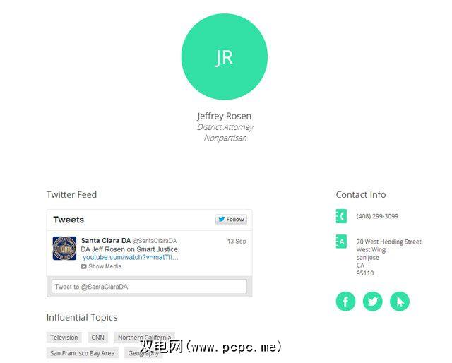 输入您的地址或邮政编码,然后“地图您的代表"将以时尚的方式显示,以显示其可以在官员身上找到的所有相关社交信息。如下面的屏幕截图所示,其中包含联系人信息和代表的官方(或非官方)主页等基本信息。嵌入式Twitter提要可能是了解重要问题或发现任何官员的政治立场的窗口。