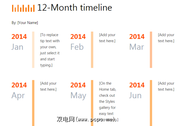 当您需要定期更新时,许多模板都很有用。例如季度财务摘要,安排假期和旅行日期或每月简单地为家中的家庭成员分配不同的琐事。另一个示例是时间轴或日历,如下所示: