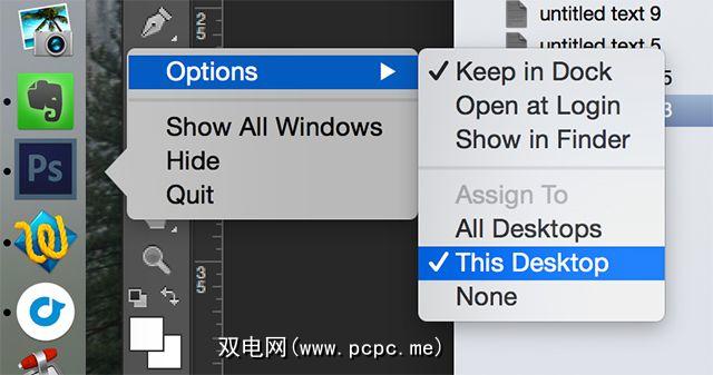 可以分配应用程序到特定的台式机,因此它们始终可以在同一位置找到。要将应用分配到桌面,请先创建桌面(如果尚未创建)并导航到该桌面。打开您选择的应用程序,并在扩展坞中两指单击或 control +单击。在选项下,选择分配到此桌面,以后该应用程序将始终在当前选定的空间中打开。