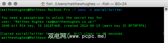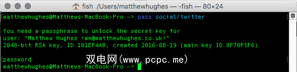 您会提示您输入GPG密码。请注意,我的真实Twitter密码不是“密码"。