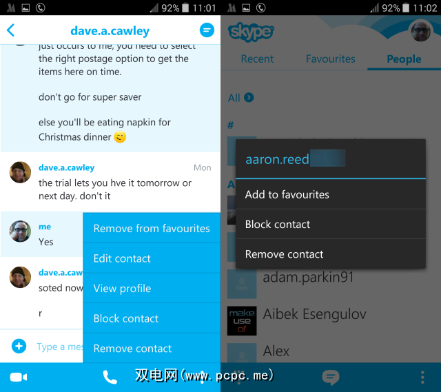 Skype中的联系人可以在 People 屏幕(通过选择联系人并长按)中进行管理,也可以通过显示与您进行的任何对话的屏幕(通过菜单)进行管理。在这里,您可以选择删除联系人以舍弃不再使用的联系人(在线犯罪分子也有可能通过网络罪犯劫持旧帐户来传播垃圾邮件)和具有确认功能的阻止联系人框,然后选择报告为垃圾邮件(如果该帐户不必要地向您发送了邮件)。