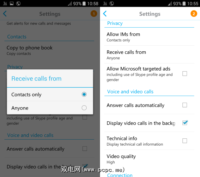 使用Android吗?您可以通过在主视图中打开菜单>设置来使用Skype隐私设置,并且可以设置允许IM 来自和接听电话从到仅限联系人,以使事情更加私密。在此部分中,您还会找到允许Microsoft定位的广告复选框,如果您不想看到这些广告或在其中显示特色,请清除该复选框。