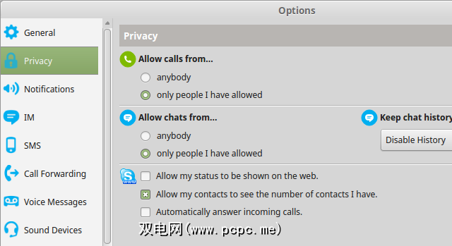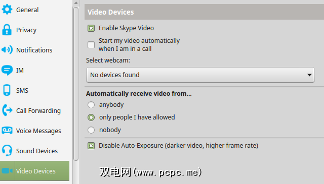 Skype的视频通话功能也可以在Linux中变得更加私密。在选项>视频设备下,确保未选中在通话中自动启动视频选项。这至少可以使您摆脱一些极为尴尬的时刻。同时,使用自动从…接收视频设置来指定谁可以向您发送视频供稿。根据您偏爱的隐私选项,选择只允许我允许的人或没人。