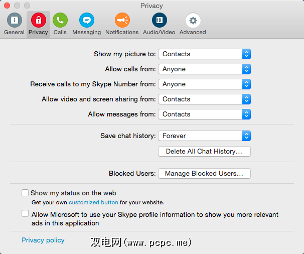 Mac OS X上的Skype拥有自己的隐私工具集合,与Windows上的差别不大。在运行并选中该应用的情况下,打开 Skype 菜单并选择首选项... 以找到隐私面板。
