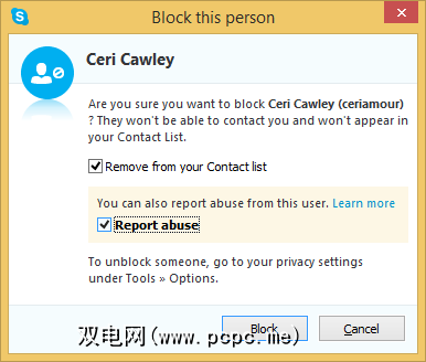 您会发现另一个复选框,举报滥用行为。如果联系人行为不正常,并且您希望Skype知道此信息,请使用此功能。