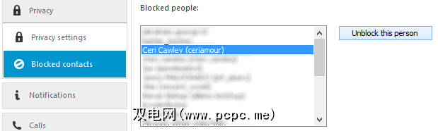 取消屏蔽联系人也很容易。在 Skype>隐私... 中,单击被阻止的联系人,单击要取消阻止的联系人,然后单击取消阻止此人。