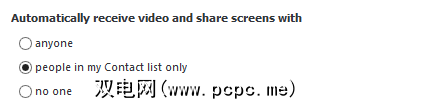 视频通话和屏幕共享也可以进行管理(在较旧的版本中,通过展开显示高级选项可以使用此选项)。在自动接收视频并与之共享屏幕下下,选择仅在我的联系人列表中的人,或为获得最严格的隐私权:没有人)。
