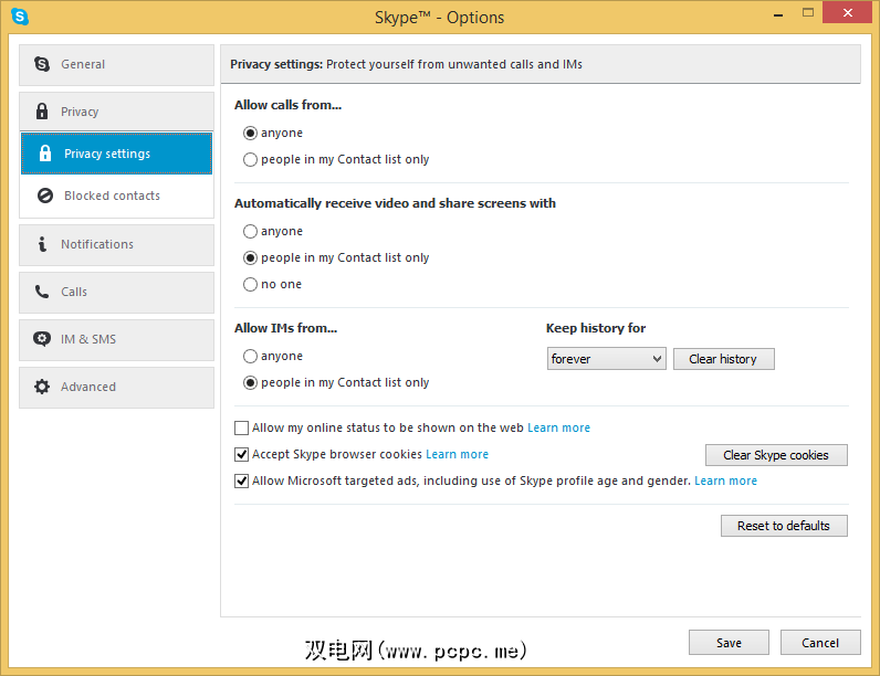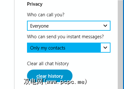 要获得超高安全性并避免各种垃圾邮件,请将这两个选项都设置为< strong>只有我的联系人。但是,您可能希望允许任何人给您打电话(如果您的Skype上有电话号码,则不是一个好主意),因此您可能希望将第一个选项设置为所有人。 Skype垃圾邮件泛滥,因此请确保设置即时消息传递选项,以便只有您在Skype上认识的人才能向您发送消息。
